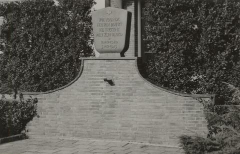Bovenop een voet van baksteen staat een metalen plaquette met de tekst: