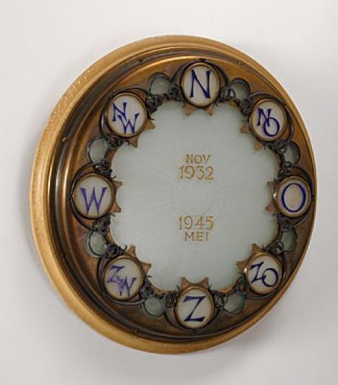 De bijgevoegde foto toont een prachtige windroos, ontworpen door W.H.Gispen ter gelegenheid van het 12,5-jarig dienstverband van zakelijk directeur Van Osselen. In het midden van het glas staat ‘nov 1932 – mei 1945’ gegraveerd. De ronde windroos heeft een houten basis met een prachtige koperen versiering rondom. Tussen het koper geven blauwe letters de verschillende windrichtingen aan.